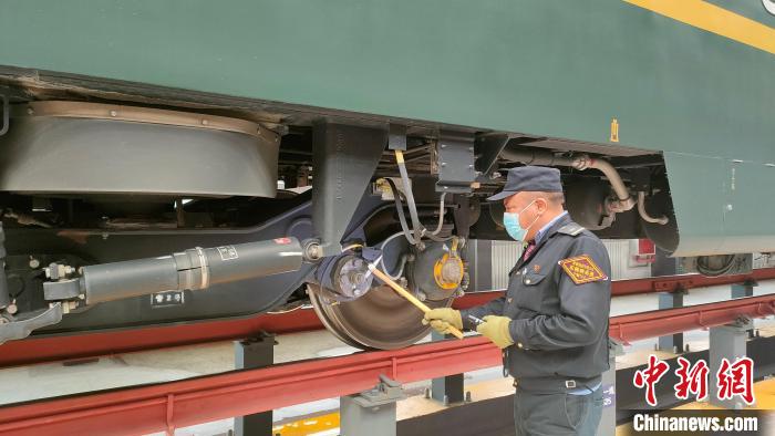 資料圖為嘎瑪達(dá)吉利用庫(kù)停時(shí)間對(duì)列車走形部進(jìn)行檢查。青藏集團(tuán)公司供圖