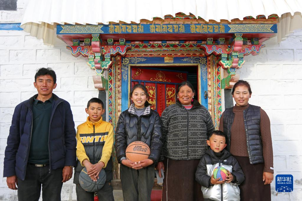 西藏自治區(qū)林芝市嘎拉村村民達(dá)瓦堅參(左一)一家在家門口合影(2022年2月23日攝)。新華社記者姜帆 攝