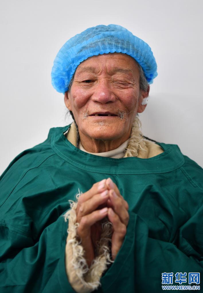 3月24日,今年82歲的西藏尼瑪縣中倉鄉(xiāng)牧民桑旦雙手合十感謝醫(yī)生。新華社記者 覺果 攝