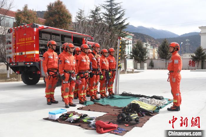 圖為消防指戰(zhàn)員正在進(jìn)行索降裝備講解。 林芝市森林消防支隊(duì) 攝