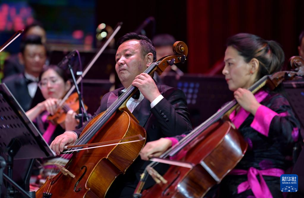 西藏愛(ài)樂(lè)樂(lè)團(tuán)的藝術(shù)家在演奏交響樂(lè)《古格幻想》(4月3日攝)。新華社記者 張汝鋒 攝