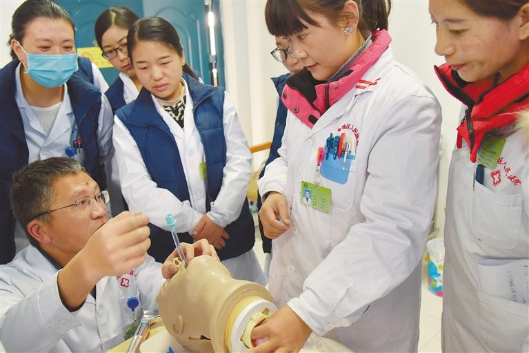 圖為西藏自治區(qū)那曲市人民醫(yī)院援藏專家手把手向醫(yī)務人員傳授“氣管插管術(shù)”動作要領(lǐng)。記者 次仁片多 攝