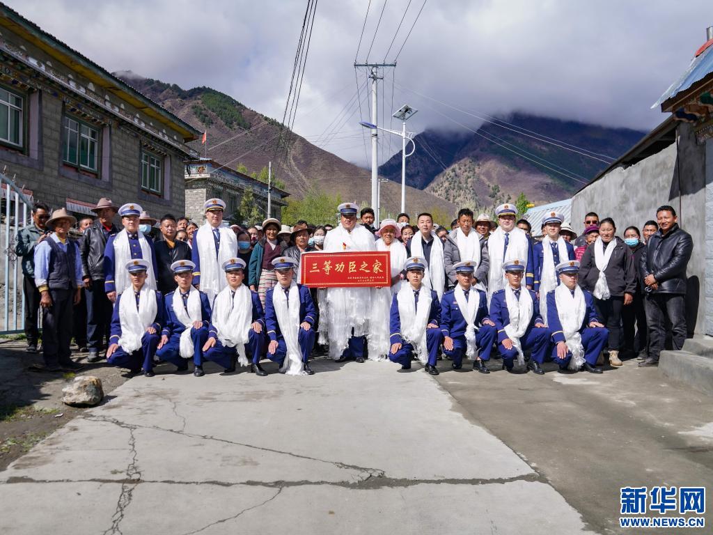 榮立三等功的消防員洛桑頓珠和隊友、鄉(xiāng)親合影留念(4月15日攝)。(李國燾攝 新華網(wǎng)發(fā))
