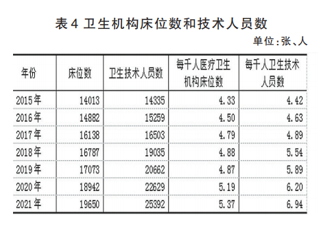 年末全區(qū)共有衛(wèi)生機(jī)構(gòu)1650個(gè)。其中,醫(yī)院179個(gè),鄉(xiāng)(鎮(zhèn))衛(wèi)生院675個(gè),社區(qū)衛(wèi)生服務(wù)中心(站)14個(gè),疾病預(yù)防控制中心82個(gè),婦幼保健院(站)36個(gè)。醫(yī)療衛(wèi)生機(jī)構(gòu)實(shí)有床位數(shù)19650張。其中醫(yī)院14808張。衛(wèi)生技術(shù)人員25392人。其中執(zhí)業(yè)(助理)醫(yī)師10448人。每千人醫(yī)療衛(wèi)生機(jī)構(gòu)床位數(shù)5.37張。每千人衛(wèi)生技術(shù)人員數(shù)6.94人。每千人執(zhí)業(yè)(助理)醫(yī)師數(shù)2.85人。