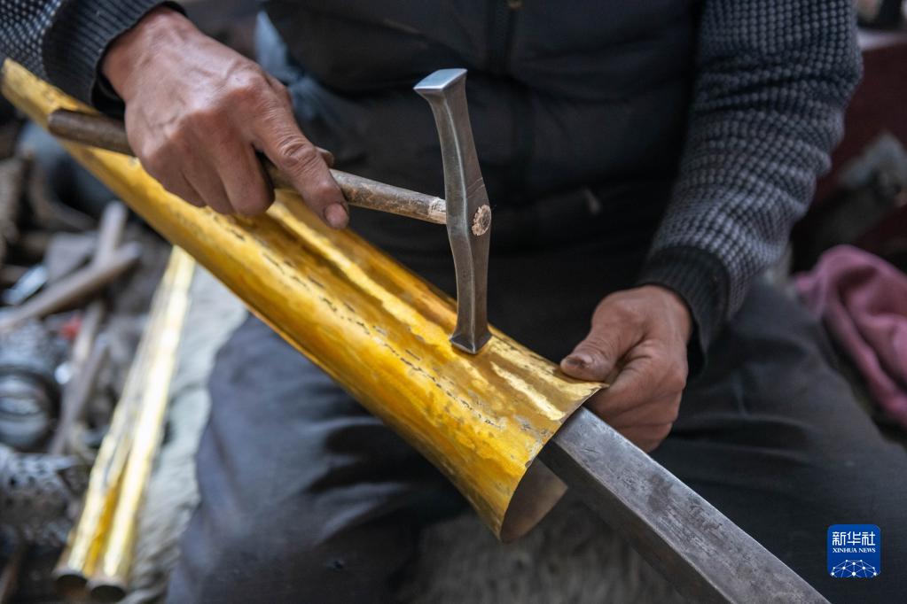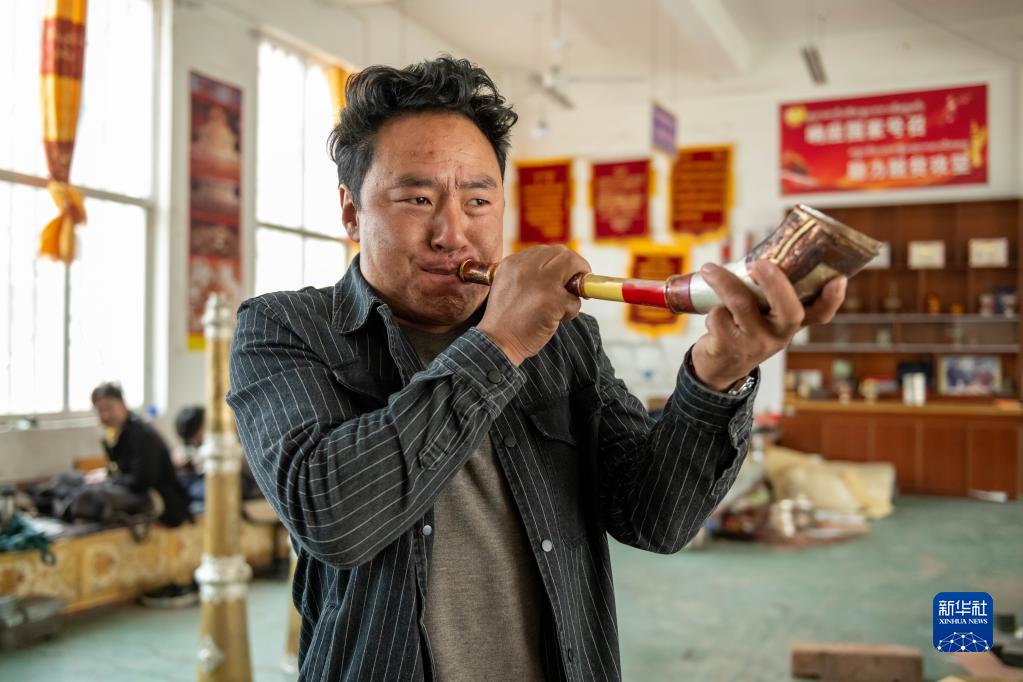 在昌都市察雅縣的產(chǎn)業(yè)車間,手工藝人吹響已加工好的樂器(4月8日攝)。新華社記者 周荻瀟 攝