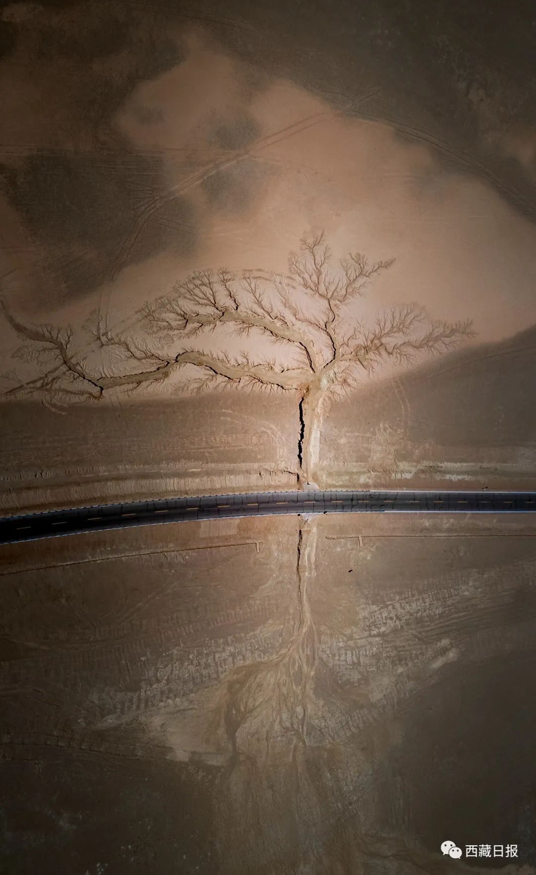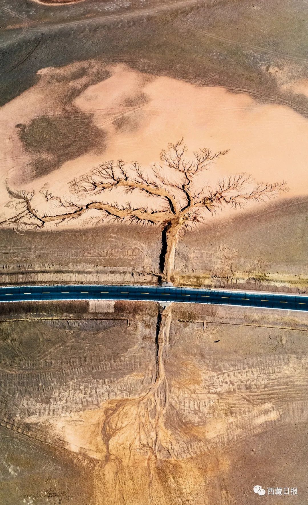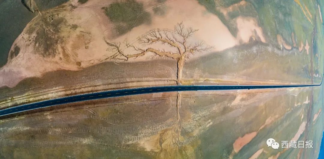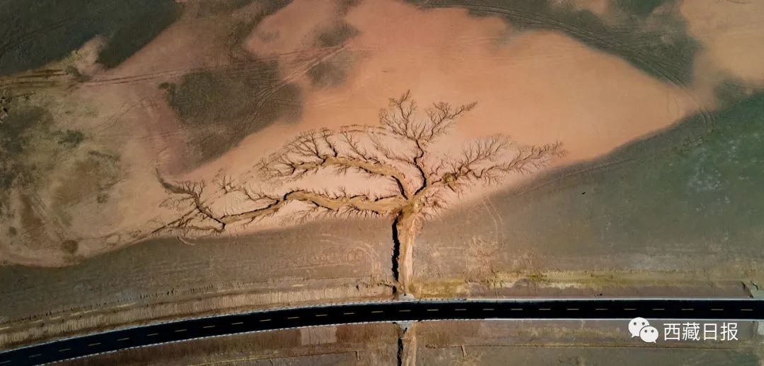 位置:“大地之樹(shù)”位于達(dá)則措南,距離尼瑪縣城30公里處,國(guó)道317 (2442)里程石墩旁邊。這棵大地之樹(shù)的樹(shù)干在國(guó)道南側(cè),樹(shù)根在國(guó)道北側(cè)。