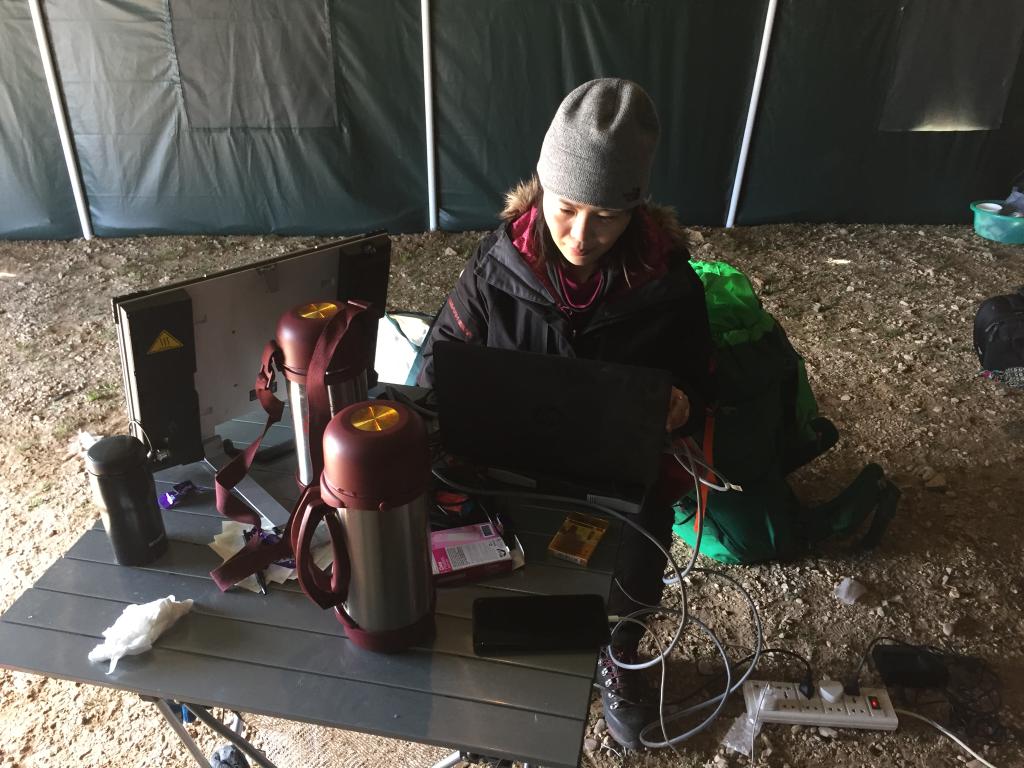 2017年6月,記者在青藏科考色林錯營地帳篷里寫稿。