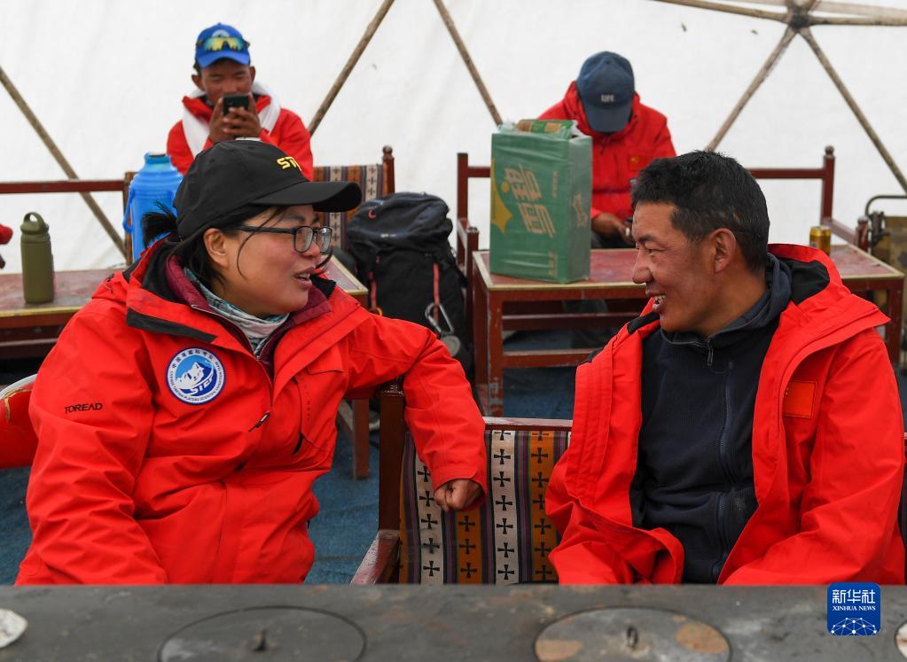 蘭州大學(xué)泛第三極環(huán)境中心劉勇勤教授(左)與順利返回大本營的登頂科考隊(duì)員德慶歐珠交流情況。(5月5日攝)。新華社記者 姜帆 攝
