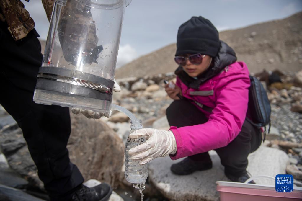 在東絨布冰川區(qū)域,科研人員正在進(jìn)行微生物指標(biāo)水樣采集(4月30日攝)。新華社記者 旦增尼瑪曲珠 攝