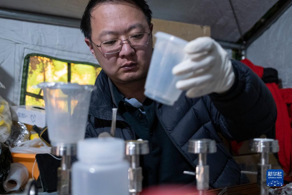 科研人員正在提取冰川融水里的微生物(4月30日攝)。 新華社記者 孫非 攝