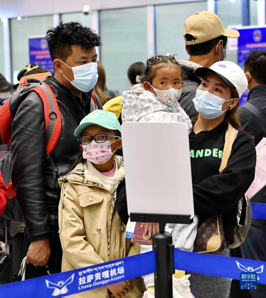 5月8日,在拉薩貢嘎機場,家長帶著患兒準(zhǔn)備安檢登機。新華社記者 張汝鋒 攝