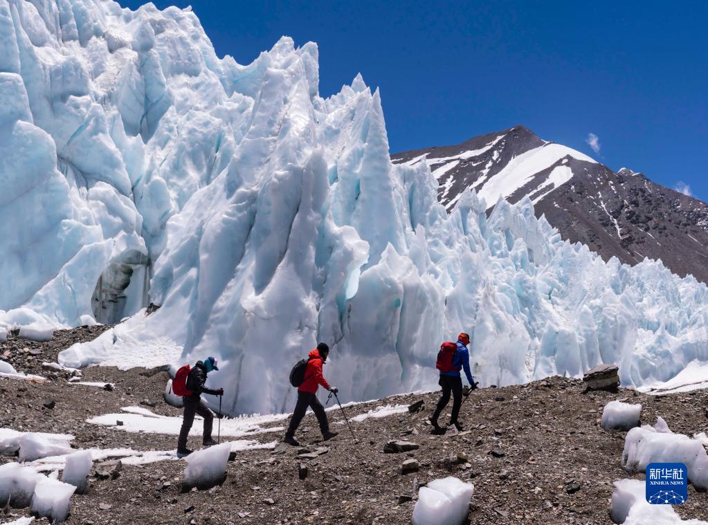 2019年5月21日,德慶歐珠(右一)在珠峰海拔6000米左右的絨布冰川冰塔林間徒步。
