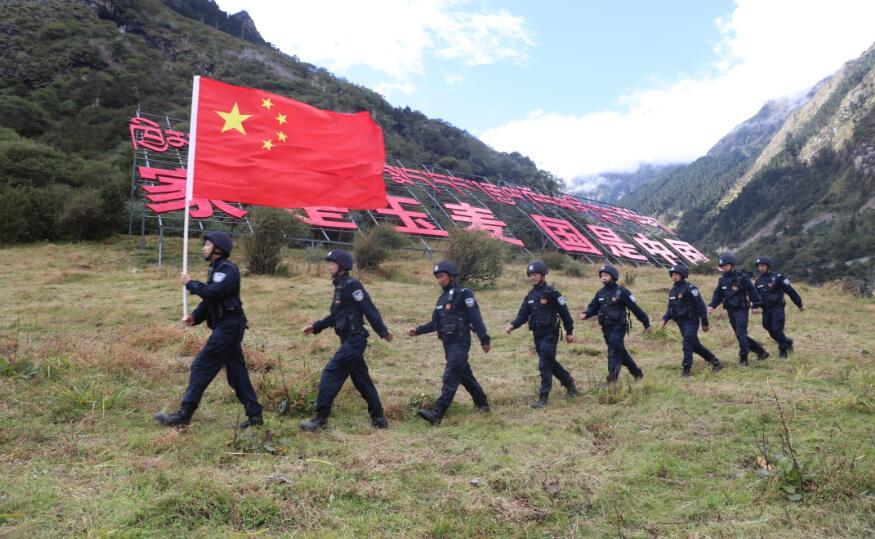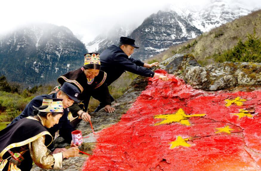 圖為玉麥邊境派出所戍邊民警與“時(shí)代楷?!鲍@得者卓嘎、央宗姐妹共同描繪國(guó)旗。蔣美靈 攝