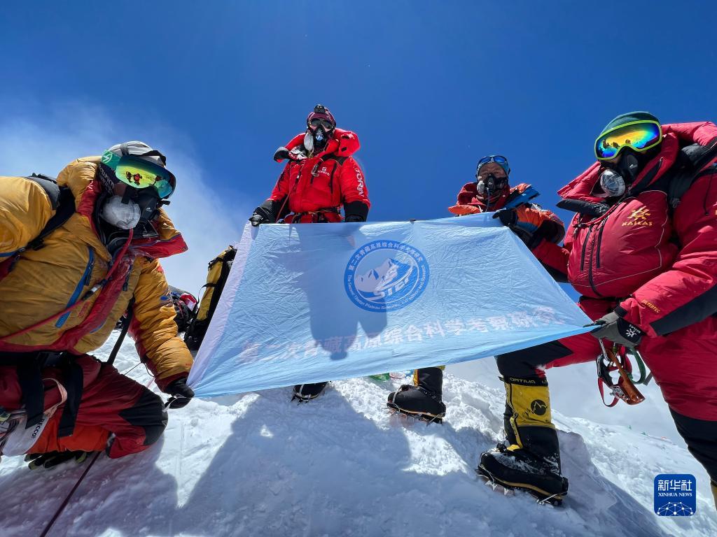 在珠穆朗瑪峰峰頂,科考隊員展示第二次青藏高原綜合科學(xué)考察研究旗幟(5月4日攝)。新華社特約記者 索朗多吉 攝