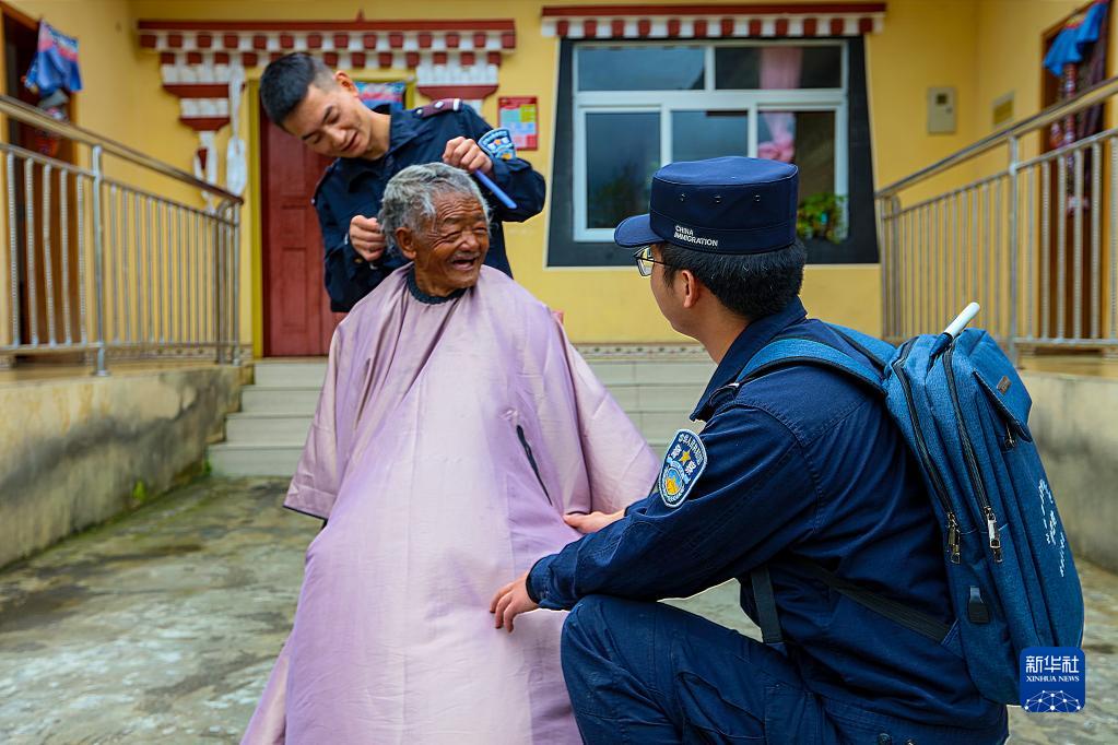 2021年負責上察隅鎮(zhèn)古巴村走訪工作的移民管理警察張棟,主動向鐘維學習理發(fā)技術(shù)。鐘維一邊給張棟分享理發(fā)經(jīng)驗,一邊讓張棟給自己剪簡單的發(fā)型。半年后,掌握了簡單理發(fā)技術(shù)的張棟,也開始給古巴村的2名老人定期理發(fā)。