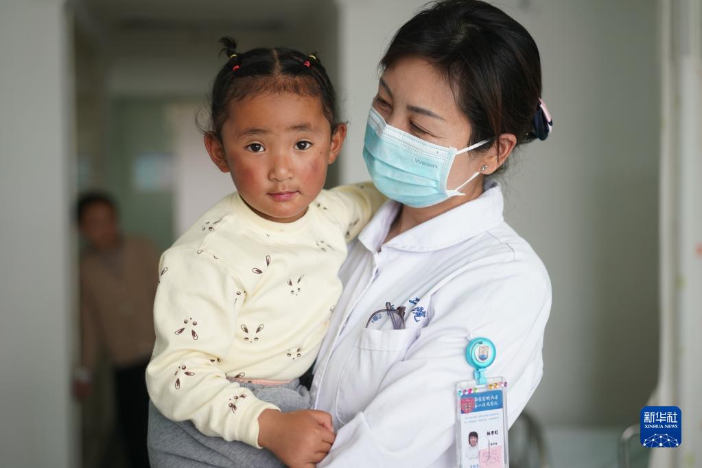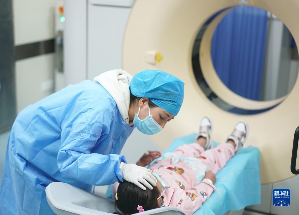 護士在安慰準備接受CT增強檢查的小患者達瓦卓瑪(5月12日攝)。