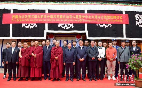 5月26日,西藏自治區(qū)圖書(shū)館大昭寺分館和自治區(qū)古籍保護(hù)中心大昭寺古籍館正式揭牌。這是繼拉薩哲蚌寺之后,又一座寺廟建立分館。圖為揭牌儀式現(xiàn)場(chǎng)。 中新社記者 貢嘎來(lái)松 攝