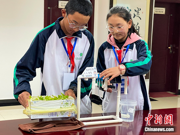 圖為智慧社區(qū)中學組參賽選手向評委老師展示作品《太陽能自動澆灌系統(tǒng)》的工作原理。 中新社記者 趙朗 攝