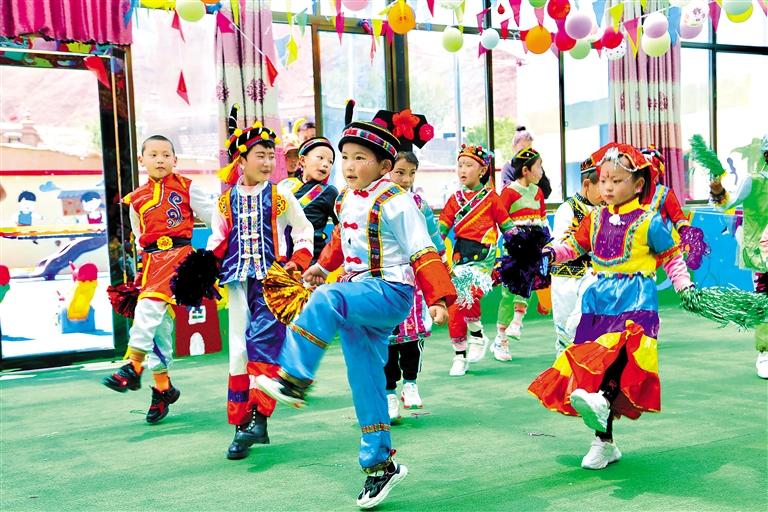 山南市瓊結(jié)縣下水村雙語(yǔ)幼兒園的孩子們?cè)诒硌菝褡鍒F(tuán)結(jié)進(jìn)步舞蹈《愛我中華》。通訊員 倫珠澤仁 記者 次旺 攝
