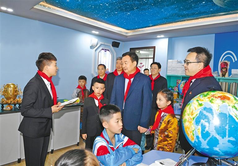 綜合教學(xué)樓二樓活動室正在進行“紅領(lǐng)巾心向黨”少先隊紅色尋訪中隊會,王君正以“大朋友”的身份參加了活動。來自林芝市第二小學(xué)四年級五班的祥秋卓嘎分享了沿著習(xí)近平爺爺?shù)淖阚E尋訪家鄉(xiāng)巴吉村的故事,如今的巴吉村早已成為名副其實的“汽車村”“旅游村”“富裕村”“小康村”。西藏第一批少先隊員、退休老黨員米瑪次仁講述了西藏第一個少先隊組織成立的歷程,當(dāng)沉淀著厚重歷史的西藏第一面少先隊旗展示在孩子們面前時,他們發(fā)出了驚嘆的聲音,那面旗幟斑駁卻格外鮮艷,時刻引領(lǐng)著孩子們奮勇爭先?!奥犃四銈冎v述的故事我很感動,大家生活在幸福的時代,希望少年兒童好好學(xué)習(xí)、天天向上!”王君正給孩子們送去《寫給青少年的黨史》等書籍,勉勵他們牢記黨的恩情、聽黨話、跟黨走,傳承紅色基因,爭做紅色少年,做黨和國家的好兒女。