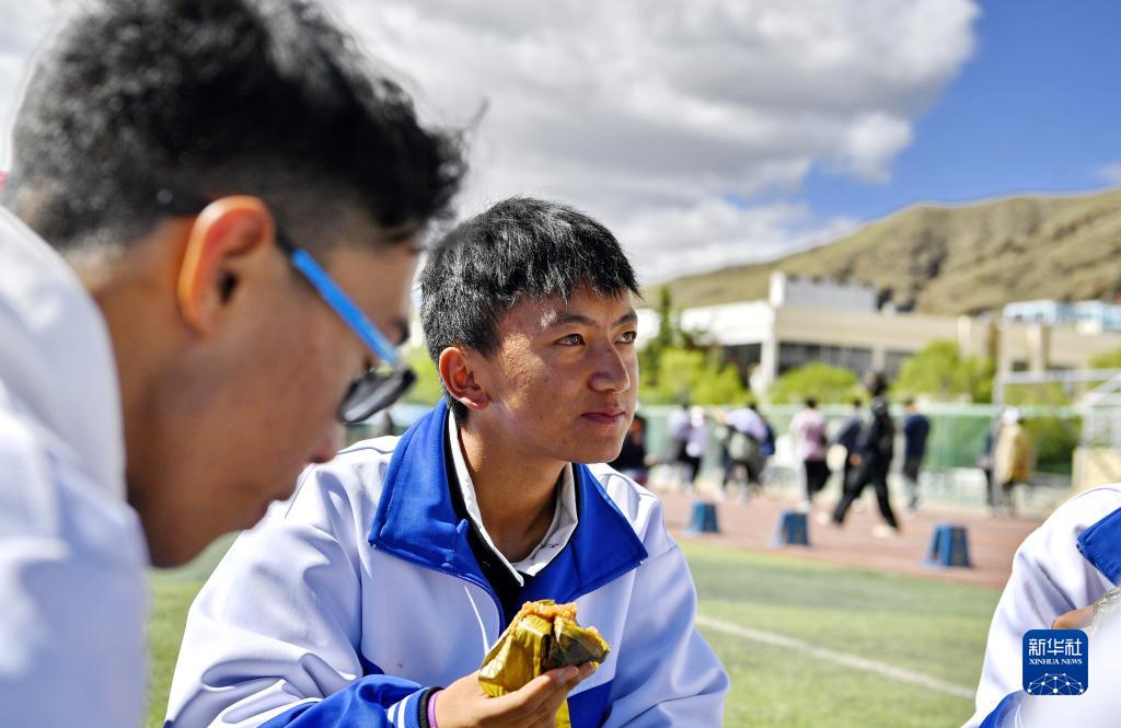 山南市第二高級(jí)中學(xué)的學(xué)生在操場吃粽子(6月3日攝)。新華社記者 劉洲鵬 攝