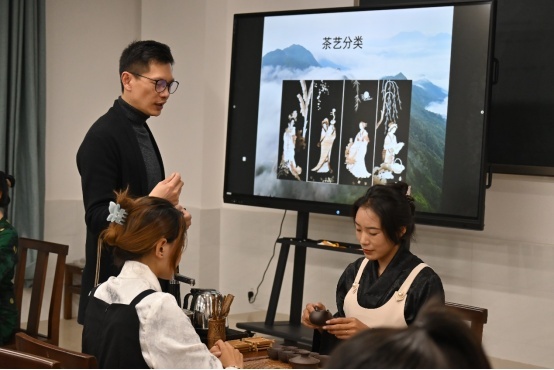 圖為黃淵老師在指導(dǎo)學(xué)生進(jìn)行茶藝實操。