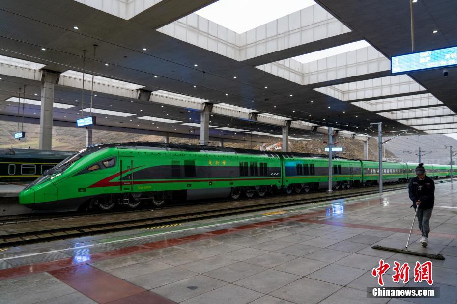 6月25日,西藏第一條電氣化鐵路——拉林鐵路開通運營滿一周年。一年來,累計運送旅客113.7萬人次、貨物4.78萬噸。圖為當日,拉薩火車站內(nèi),復興號整裝待發(fā)。 中新社記者 江飛波 攝