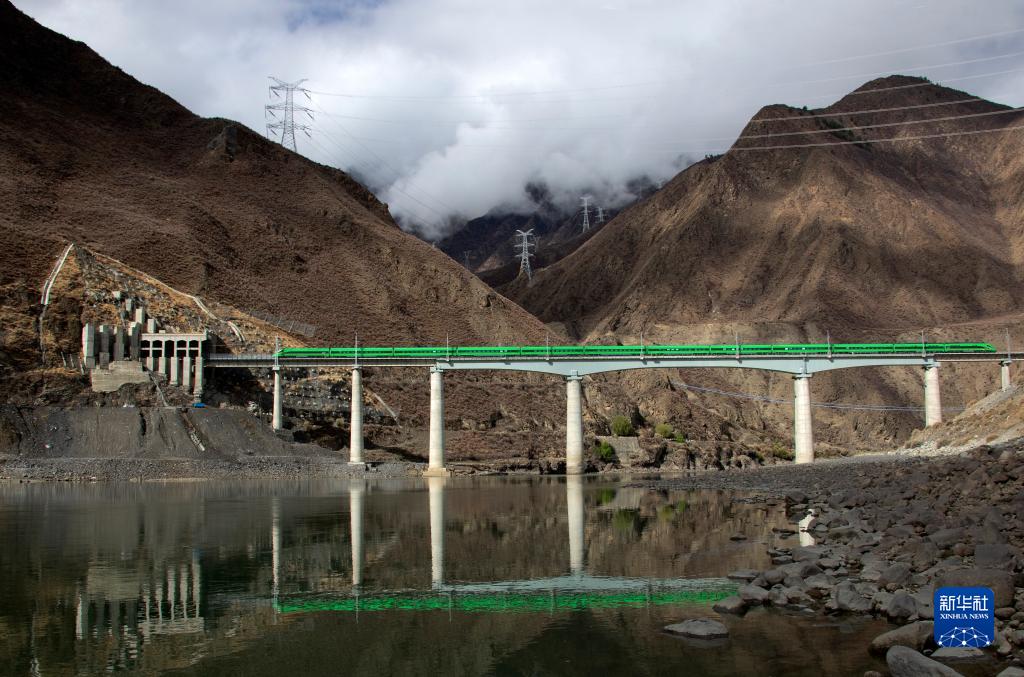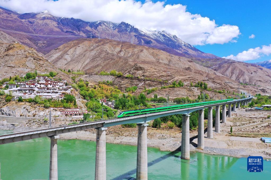 4月14日,復(fù)興號(hào)列車行駛在西藏朗縣境內(nèi)的雅魯藏布江上。新華社記者 覺果 攝