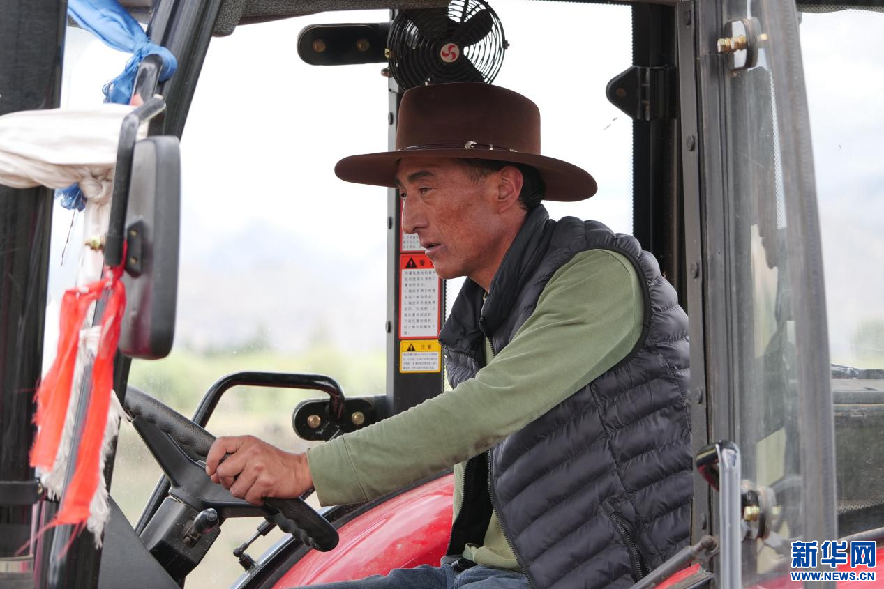 6月20日,甘曲鎮(zhèn)江角村農(nóng)機(jī)合作社負(fù)責(zé)人米瑪在駕駛農(nóng)機(jī)。新華網(wǎng) 旦增努布 攝