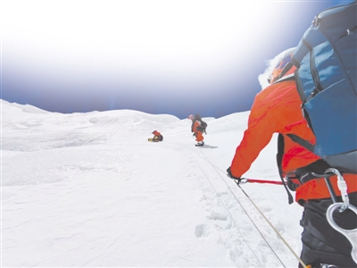 但還是碰上了意外。從8300米再往上走,積雪有五六十厘米深,沿路安全繩都被雪埋了。安全繩是登頂?shù)纳K,大家必須把繩子拽出來,抖掉冰,再一點點前進。到達海拔8800米處,比原計劃晚了三個小時。