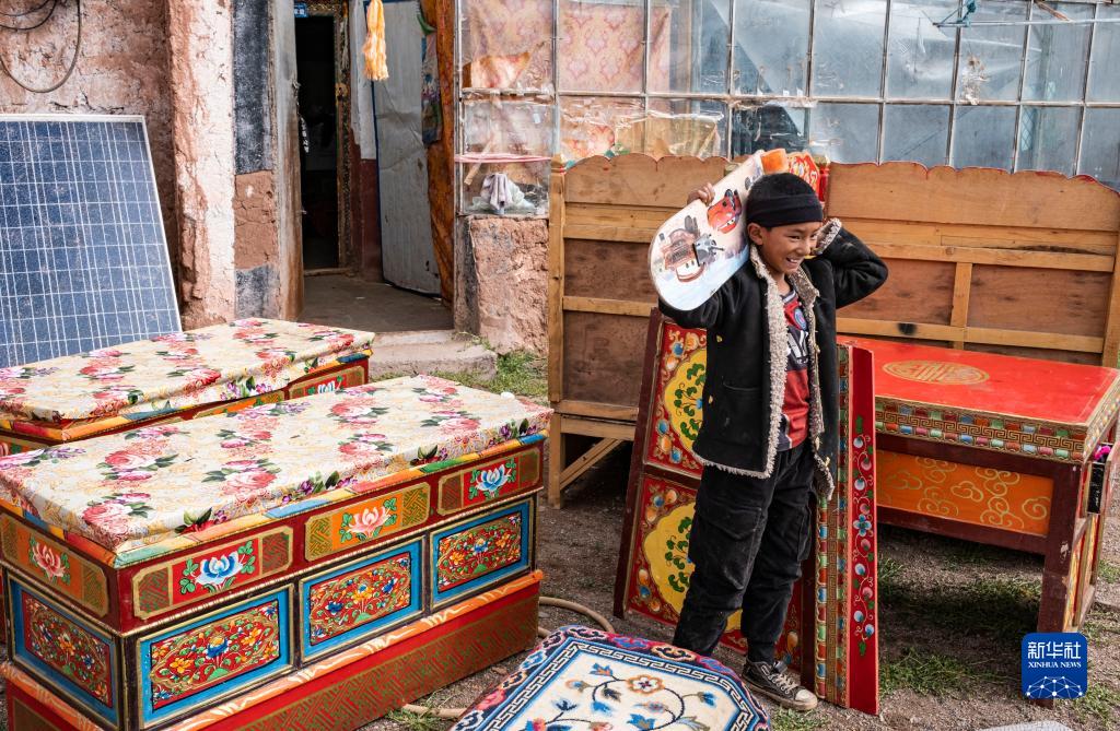雙湖縣多瑪鄉(xiāng)仲魯瑪村的孩子拿著自己心愛的滑板。雖然滑板的輪子已經(jīng)掉了,他還是想帶到新家去(7月13日攝)。新華社記者 孫非 攝