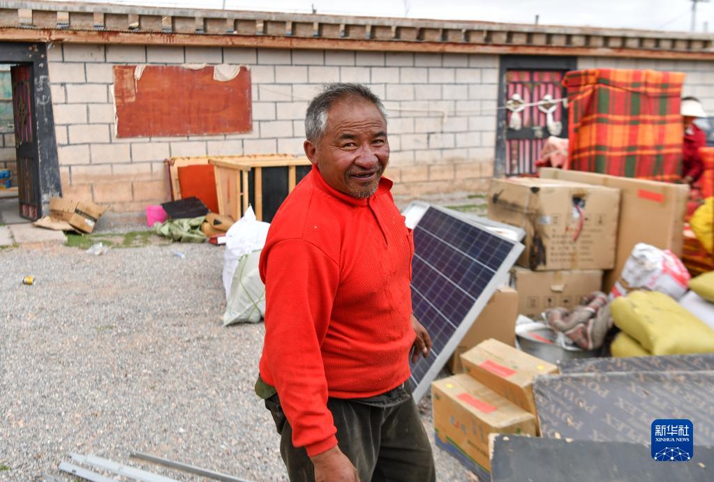 雙湖縣多瑪鄉(xiāng)仲魯瑪村牧民索朗措加在整理即將搬運(yùn)到森布日安置點(diǎn)的家具(7月12日攝)。新華社記者 晉美多吉 攝