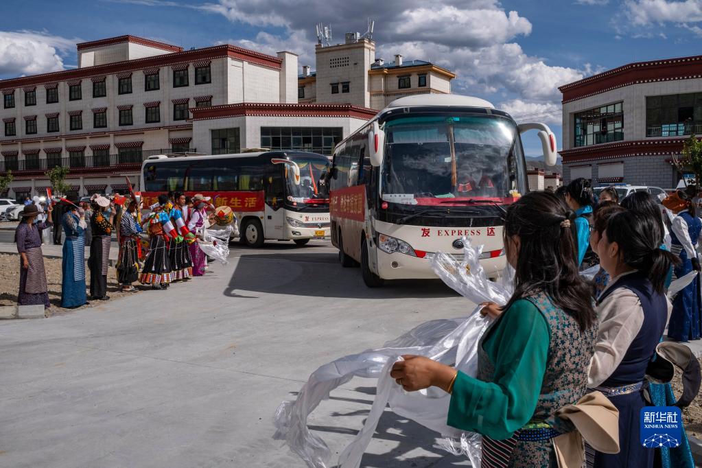 一陣陣激昂的藏戲鼓聲、一聲聲“歡迎到家”的美好祝福,當(dāng)?shù)厝罕娛峙e象征五谷豐登的“切瑪盒”,逐一獻上哈達,迎接新鄰居。