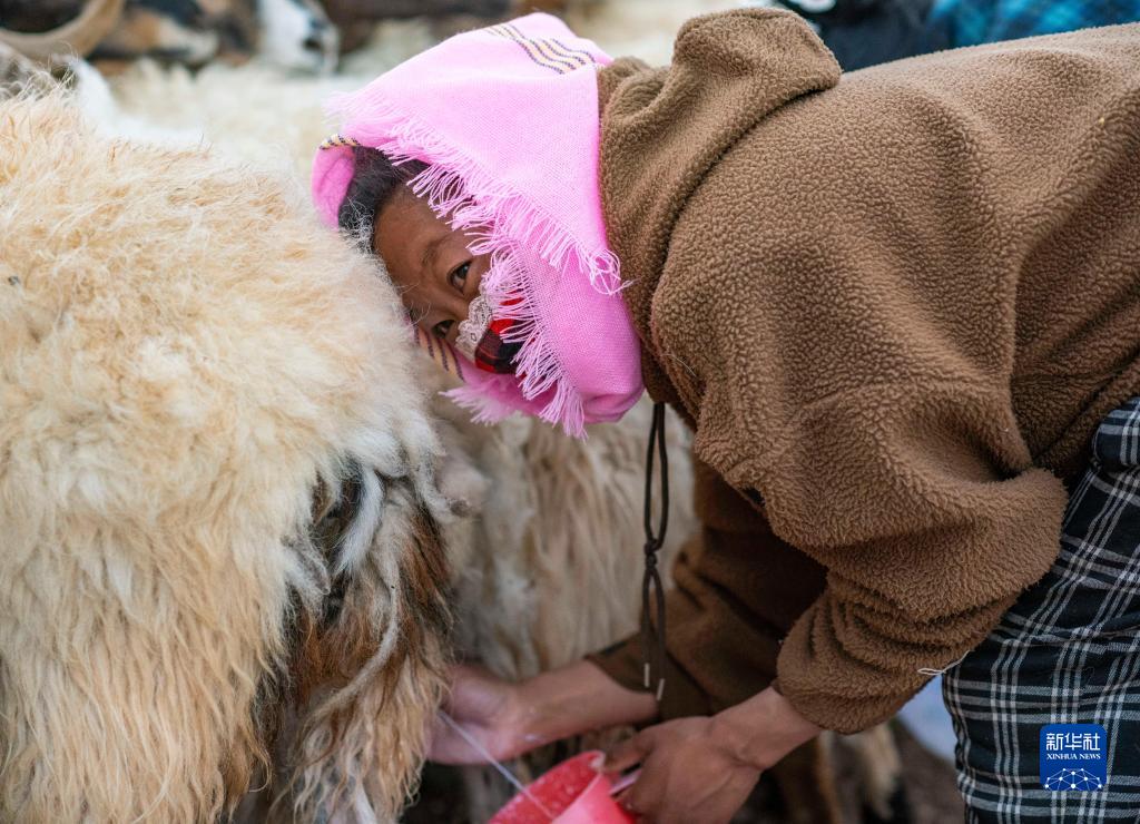 傍晚,男人們放牧歸來,羊群被趕到圍欄邊,嘎瑪?shù)耐鈱O女石秀措姆加入了擠奶的隊伍。
