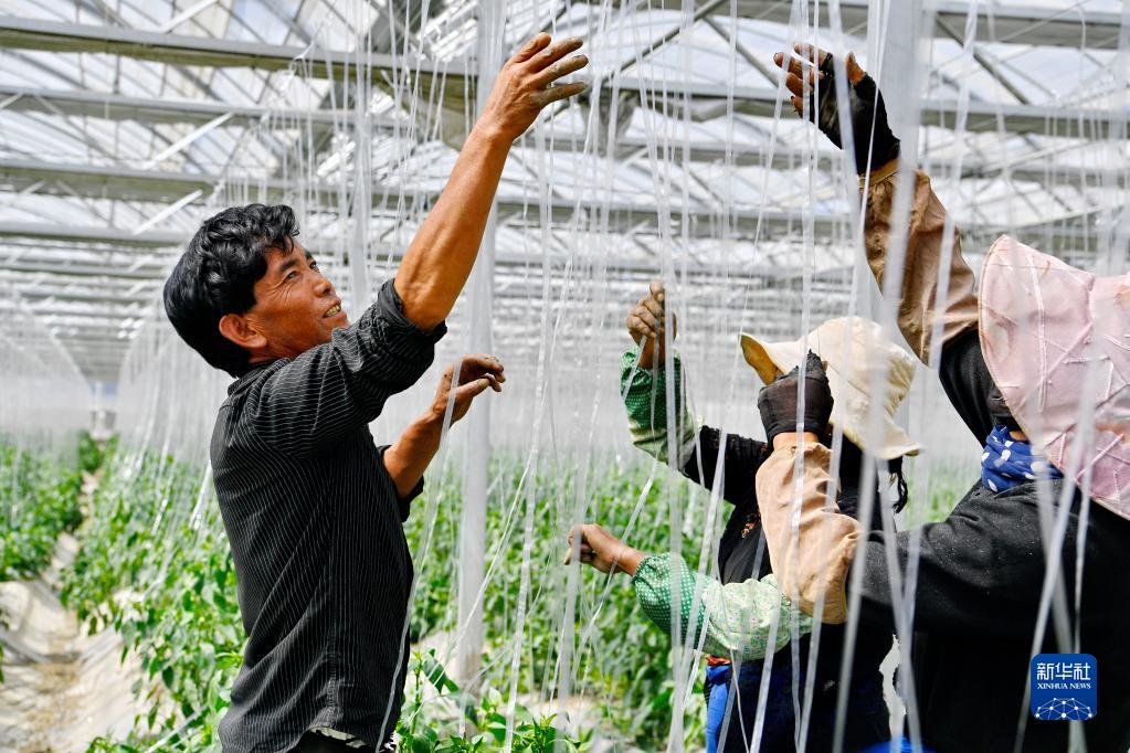 戴著遮陽(yáng)帽,一邊修剪辣椒枝條,一邊系繩吊枝,兩三人搭檔,有說(shuō)有笑。這是記者在西藏山南市瓊結(jié)縣千畝蔬菜基地看到的場(chǎng)景。