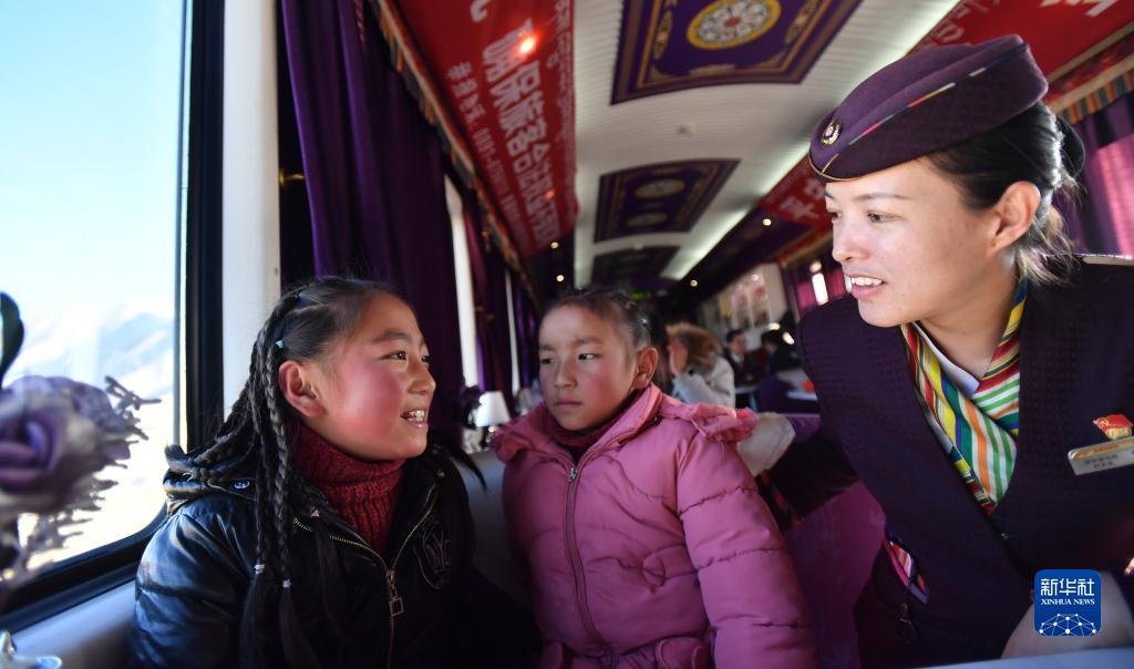 青藏鐵路拉薩至日喀則段的藏族女列車長(zhǎng)貢久曲珍(右)與乘客聊天(2020年1月12日攝)。新華社記者 覺果 攝