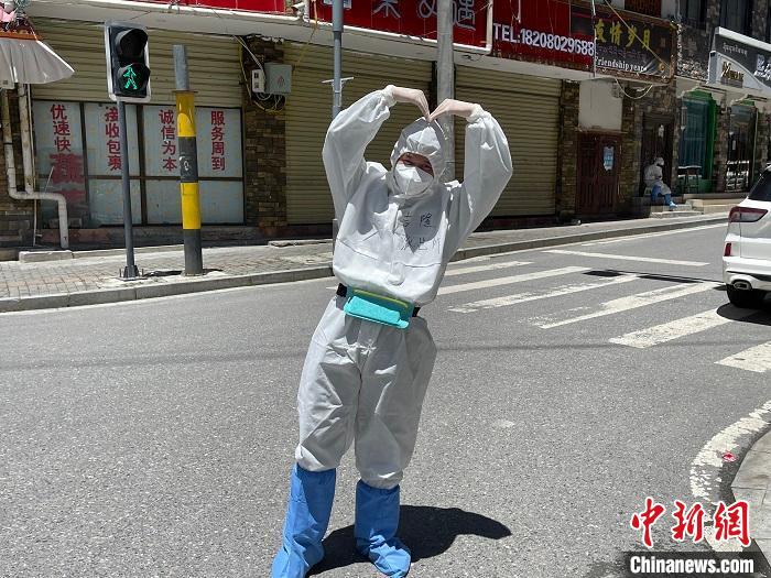 民警賀東在做好自身防護(hù)的前提下不停巡邏排查,一轉(zhuǎn)就是8個(gè)小時(shí)。他為民眾、游客及工人聯(lián)系購(gòu)買(mǎi)生活物資、煤氣等。汗水浸濕在口罩里,不到一會(huì),“大白”就能“喝”到自己的汗水。