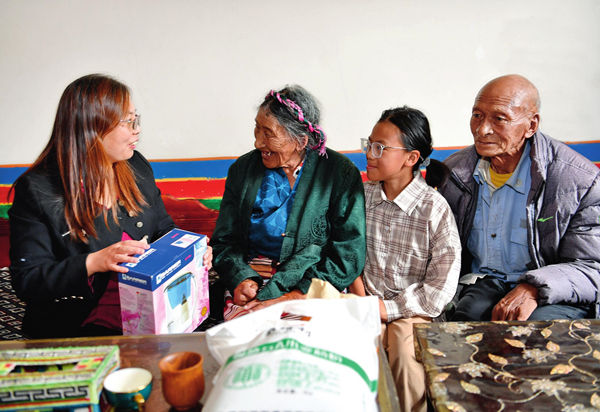 王玉秀(左一)來到拉薩市達孜區(qū)德慶鎮(zhèn)次旦老人家走訪并送上慰問品(2022 年 7月 27 日攝) 張汝鋒攝
