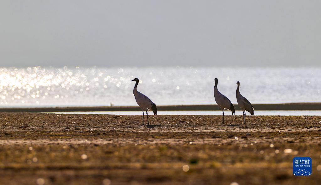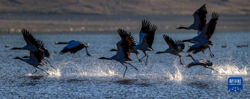 在林周縣虎頭山水庫拍攝的黑頸鶴(11月6日攝)。新華社記者 姜帆 攝