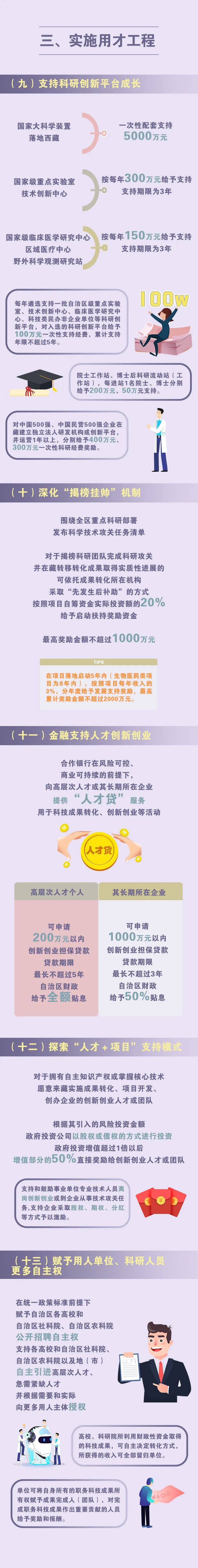支持科研創(chuàng)新平臺(tái)成長(zhǎng),對(duì)重點(diǎn)實(shí)驗(yàn)室、技術(shù)創(chuàng)新中心以及院士工作站、博士后科研流動(dòng)站(工作站)等給予經(jīng)費(fèi)支持。深化“揭榜掛帥”機(jī)制,對(duì)完成科研攻關(guān)并在藏轉(zhuǎn)化成果取得實(shí)質(zhì)性進(jìn)展的,給予啟動(dòng)扶持獎(jiǎng)勵(lì)資金、發(fā)展支持獎(jiǎng)勵(lì)資金。向高層次人才或其長(zhǎng)期所在企業(yè)提供“人才貸”服務(wù),自治區(qū)財(cái)政予以貼息。鼓勵(lì)創(chuàng)新創(chuàng)業(yè)人才或團(tuán)隊(duì)來(lái)藏實(shí)施成果轉(zhuǎn)化、項(xiàng)目開(kāi)發(fā)、創(chuàng)辦企業(yè),政府投資公司參與創(chuàng)新創(chuàng)業(yè)項(xiàng)目,政府投資增值的部分收益可直接用于獎(jiǎng)勵(lì)。在統(tǒng)一政策標(biāo)準(zhǔn)、嚴(yán)格執(zhí)行規(guī)定前提下,賦予用人單位、科研人員更多自主權(quán)。
