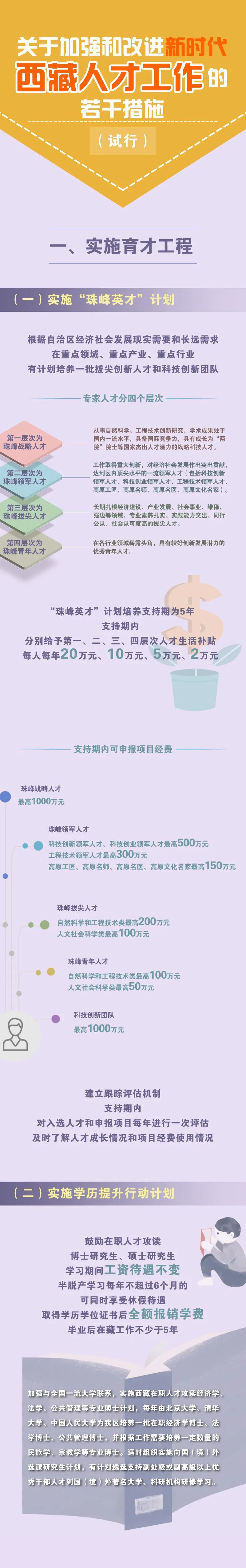實(shí)施“珠峰英才”計(jì)劃,每年遴選支持一批珠峰戰(zhàn)略人才、珠峰領(lǐng)軍人才、珠峰拔尖人才、珠峰青年人才和科技創(chuàng)新團(tuán)隊(duì),在5年支持期內(nèi)給予生活補(bǔ)貼和項(xiàng)目經(jīng)費(fèi)支持,項(xiàng)目經(jīng)費(fèi)最高可申請(qǐng)1000萬(wàn)元。實(shí)施學(xué)歷提升行動(dòng),支持在職人才攻讀研究生,并協(xié)調(diào)全國(guó)頂尖高校為西藏定向培養(yǎng)博士研究生。