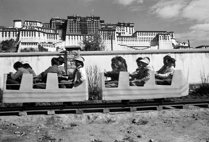 1987年10月1日,在拉薩勞動人民文化宮內(nèi)新建成一座大型游樂場里,小朋友們在乘坐電動小火車。