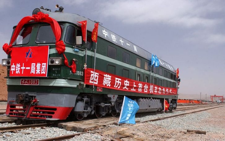2004年3月23日,在海拔4704米的青藏鐵路海拔最高鋪架基地——西藏安多鋪架基地上,中鐵十一局1083號東風(fēng)4型內(nèi)燃機車向雪域高原緩緩駛來。這標(biāo)志著西藏歷史上出現(xiàn)了第一臺鐵路機車。