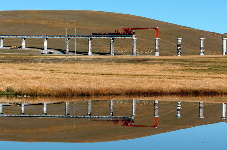 2004年10月1日,工人們正在架設(shè)青藏鐵路那曲以橋代路特大橋。