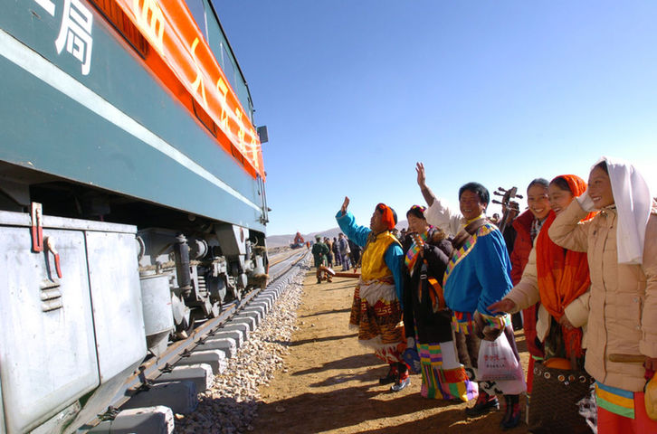2004年10月10日,藏北群眾迎接火車抵達那曲。10月9日,青藏鐵路安多到那曲138公里的鋪軌完成。10月10日,從安多出發(fā)的西藏境內(nèi)第一列火車上午10點抵達藏北重鎮(zhèn)——那曲鎮(zhèn)。