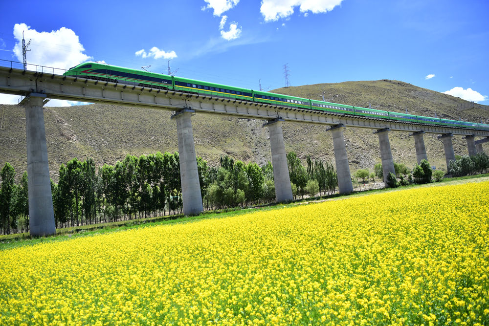 拉林鐵路上的火車,經(jīng)過藏南的油菜田(2022年6月22日攝)