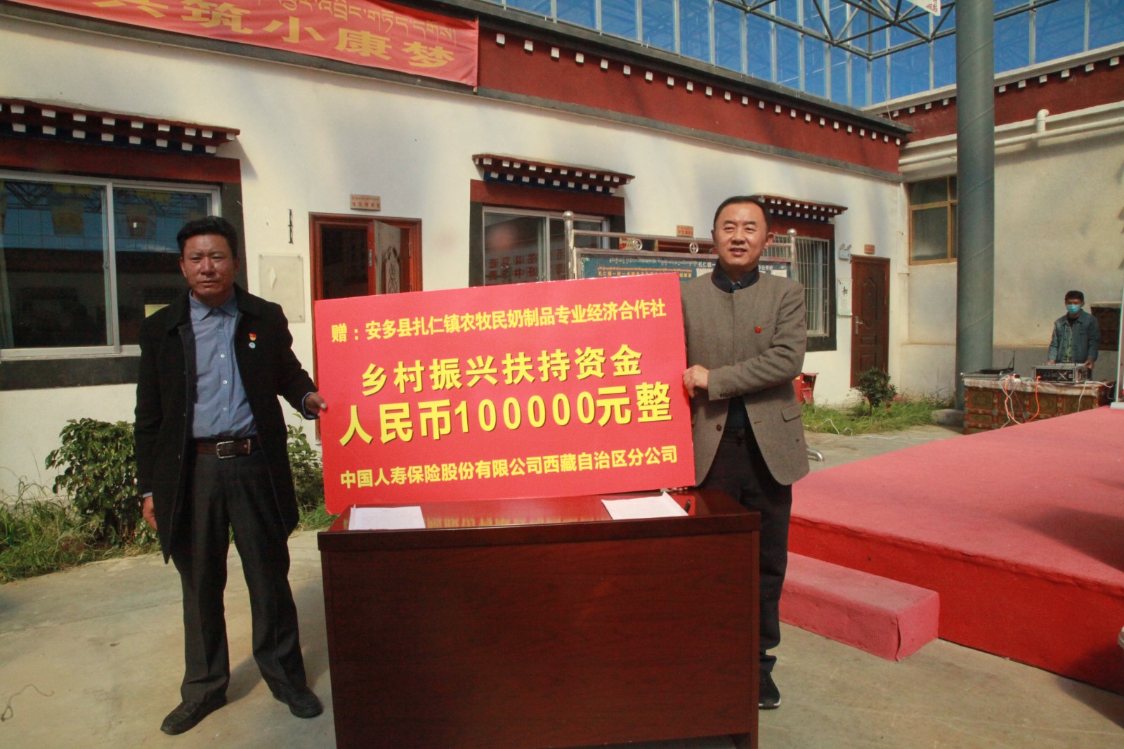 圖為中國人壽西藏分公司向那曲市安多縣扎仁鎮(zhèn)納色社區(qū)捐贈產(chǎn)業(yè)扶持資金10萬元。