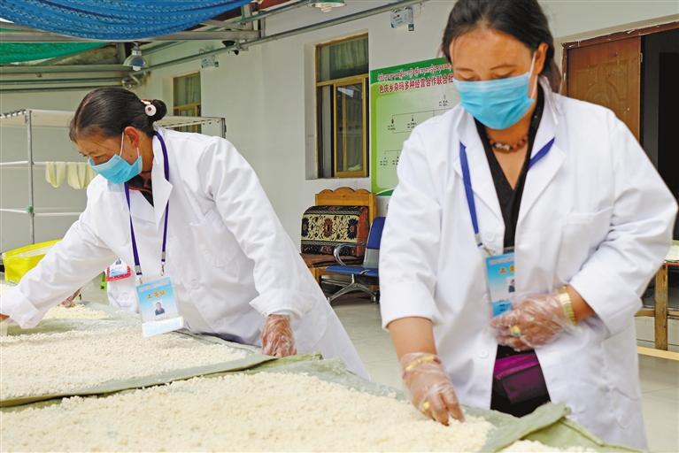 圖為聶榮縣色慶鄉(xiāng)雜瑪多種經(jīng)營合作社工作人員對奶渣進行干燥處理。 記者 萬靖 謝偉 攝