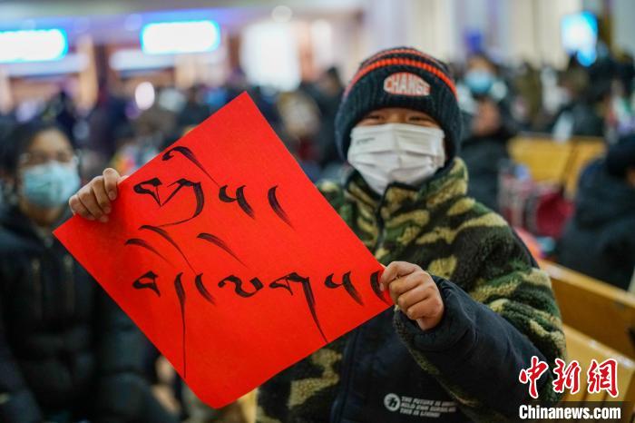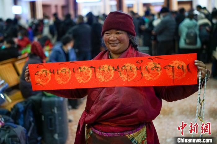 圖為春運(yùn)首日,拉薩火車站一旅客獲得車站送的藏式春聯(lián),上面書寫的是藏語(yǔ)“扎西德勒”?!〗w波 攝
