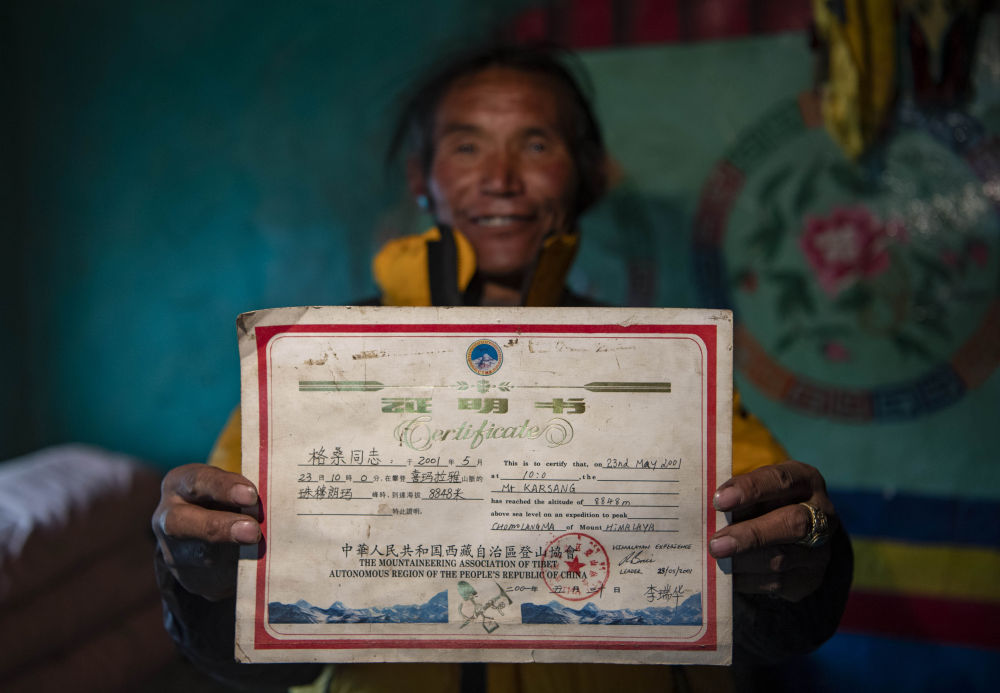 和下了山后日子過得風(fēng)生水起的多吉不同,格桑傳奇的經(jīng)歷,并沒有給生活帶來什么本質(zhì)的改變。格桑并沒有出名,在他看來,登頂?shù)慕?jīng)歷除了能證明自己身體好,也說不出其他意義。登頂照片搬家的時(shí)候就找不到了,除了一張登頂證書,還留下的紀(jì)念品,就是“冬天放牧?xí)r穿著暖和的連體羽絨服”。